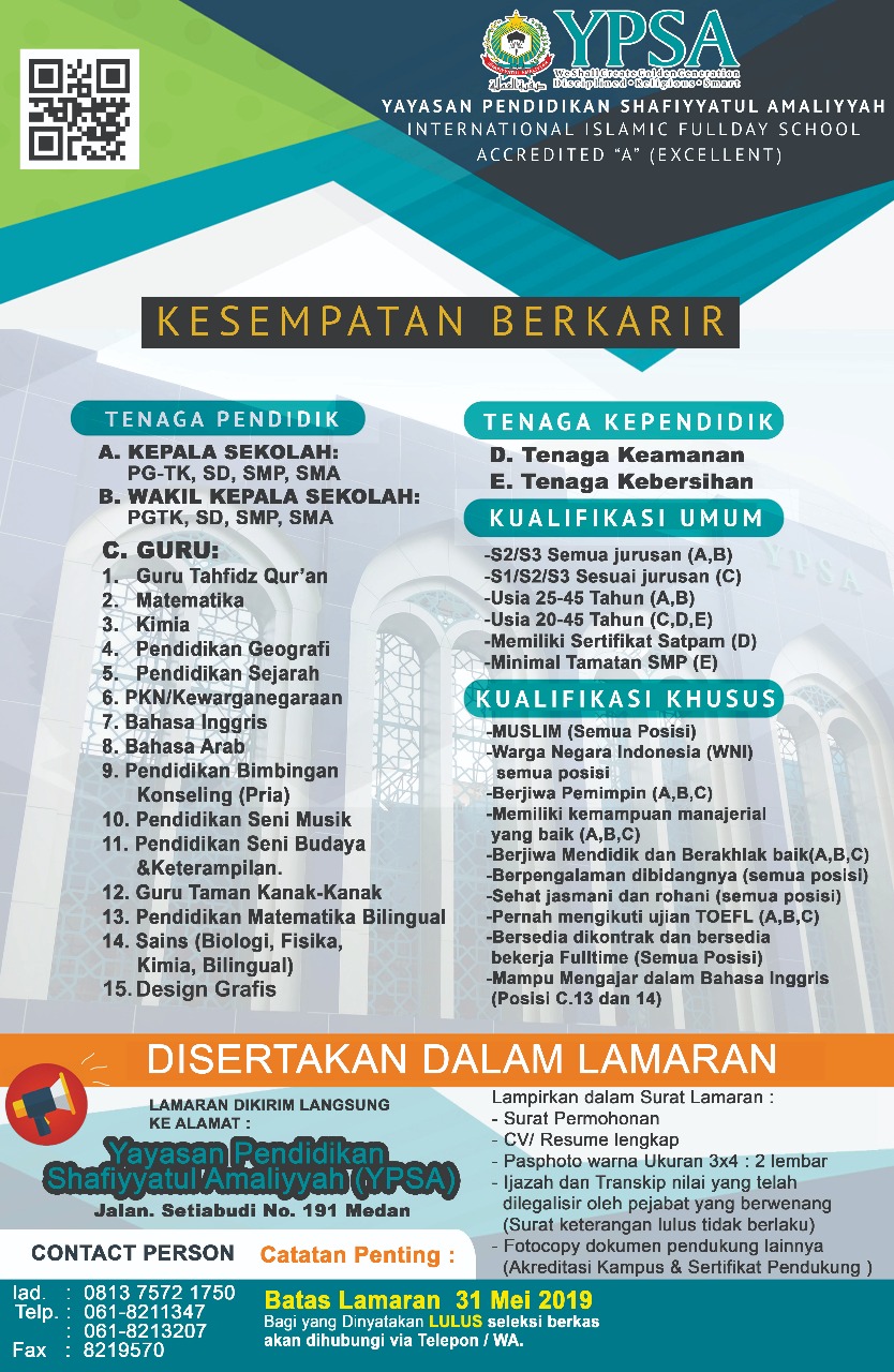 Medanloker - Lowongan Kerja Medan Terbaru di Yayasan Pendidikan Shafiyyatul Amaliyyah (YPSA) didirikan pada 20 Desember 1997 oleh Almh. Hj. Djamaliyah (Ibunda Pembina YPSA, Buya Drs. H. Sofyan Raz, Ak., M.M.) beserta badan pendiri lain yang juga merupakan keluarga inti Buya Sofyan Raz dan Umi Hj. Rahmawaty Sofyan Raz. Kisah pendirian YPSA sendiri dimulai dari panggilan hati yang tulus dari seorang Umi Hj. Rahmawaty Sofyan Raz (akrab dipanggil Umi Etty, saat ini menjabat sebagai Ketua Umum YPSA) untuk membaktikan diri mengajar kalam Allah dalam suatu wadah Taman Pembelajaran Al-Quran (TPA) di garasi rumah Beliau.